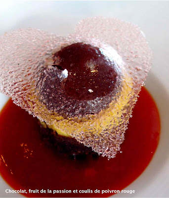 Une barbapapa de la Saint-Valentin avec ses petits cœurs précéde une coque de chocolat aux fruits de la passion et coulis de poivron rouge ornée elle aussi de son cœur de sucre rose (assez décevant pour ma part mais je n’aime pas le poivron rouge avec le chocolat, précédement testé chez Sébastien Gaudard).